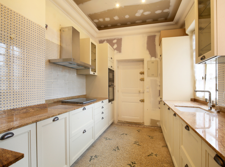 Cuisine intégrée neuve avec électroménager encastré (plaque induction, hotte, four, micro-ondes, réfrigérateur-congélateur, lave-vaisselle).
